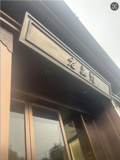 大門整體使用不銹鋼材質,八個不銹鋼字耐磨耐曬耐腐蝕,地拉彈簧門上放棄使用傳統拉手,改用定制云紋拉手,使得大門的質感更上一層樓。